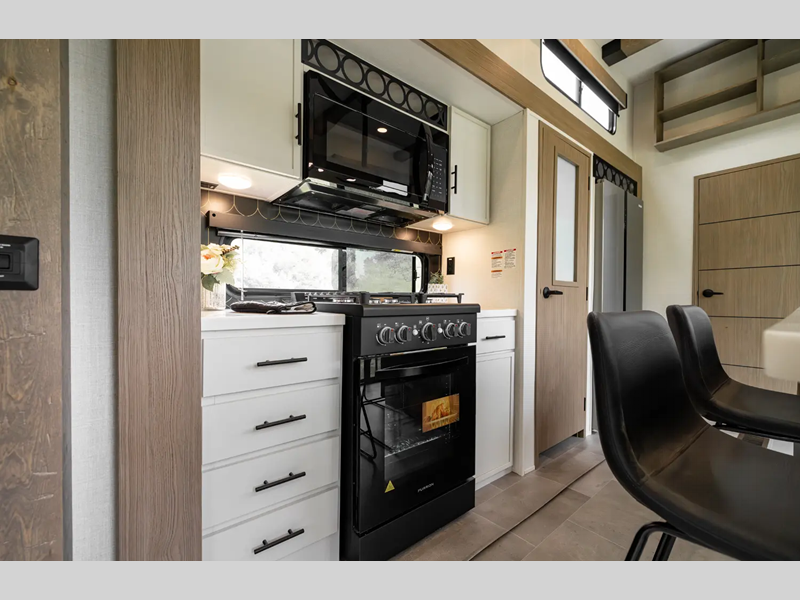 Each fifth wheel is constructed with an vacuum bonded aluminum structure with laminated aluminum sidewalls, slide boxes, a front wall and floor, plus one-piece Tufflex PVC roofing for more strength. The exterior offers a black tank flush, winterization and sanitation an enclosed docking station, and off-grid camping including a solar on the side prep. The interior includes residential linoleum, blackout curtains and roller shades, residential backsplash, and oversized opening windows for great views and circulation of natural air.