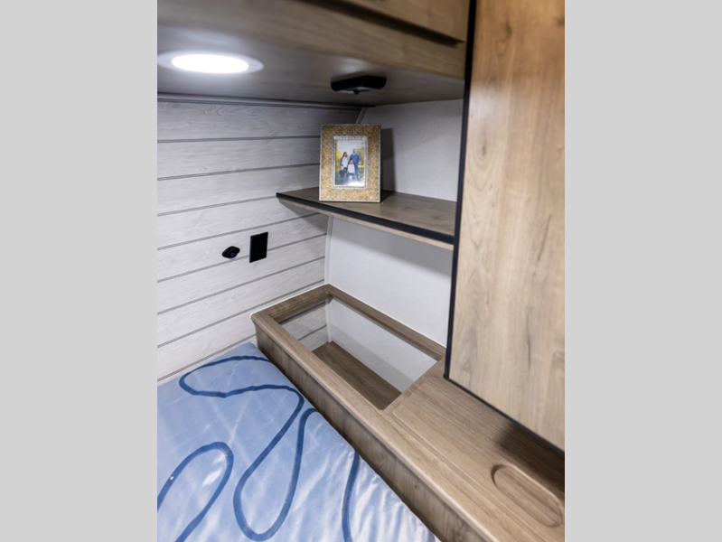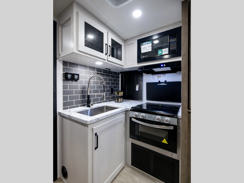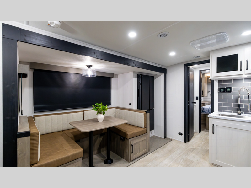 Each model is constructed with a fully enclosed and heated underbelly plus a fully laminated roof for added durability. There is also a power tongue jack outside, along with a power awning with LED lights, and slam latch baggage doors with magnets. Inside, you'll find roller shades, ball bearing drawer guides, USB ports, and more comforts and conveniences.