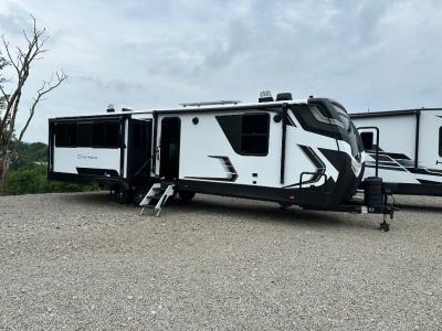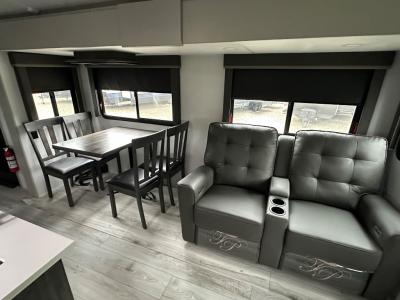 Whether you camp for inside comforts or outside adventures, this trailer will provide the comfort once you step inside. The rear living area has a sofa sleeper for guests, three slides throughout for maximum floor space, and a 10 cu. ft. 12V GE refrigerator. There is a 50" HDTV and fireplace to enjoy, theater seats, and a booth dinette, or you can choose a table and chairs option in its place. The full bathroom will let you freshen up each night, and the bedroom offers a king bed, front wardrobe, washer/dryer prep, and more storage.